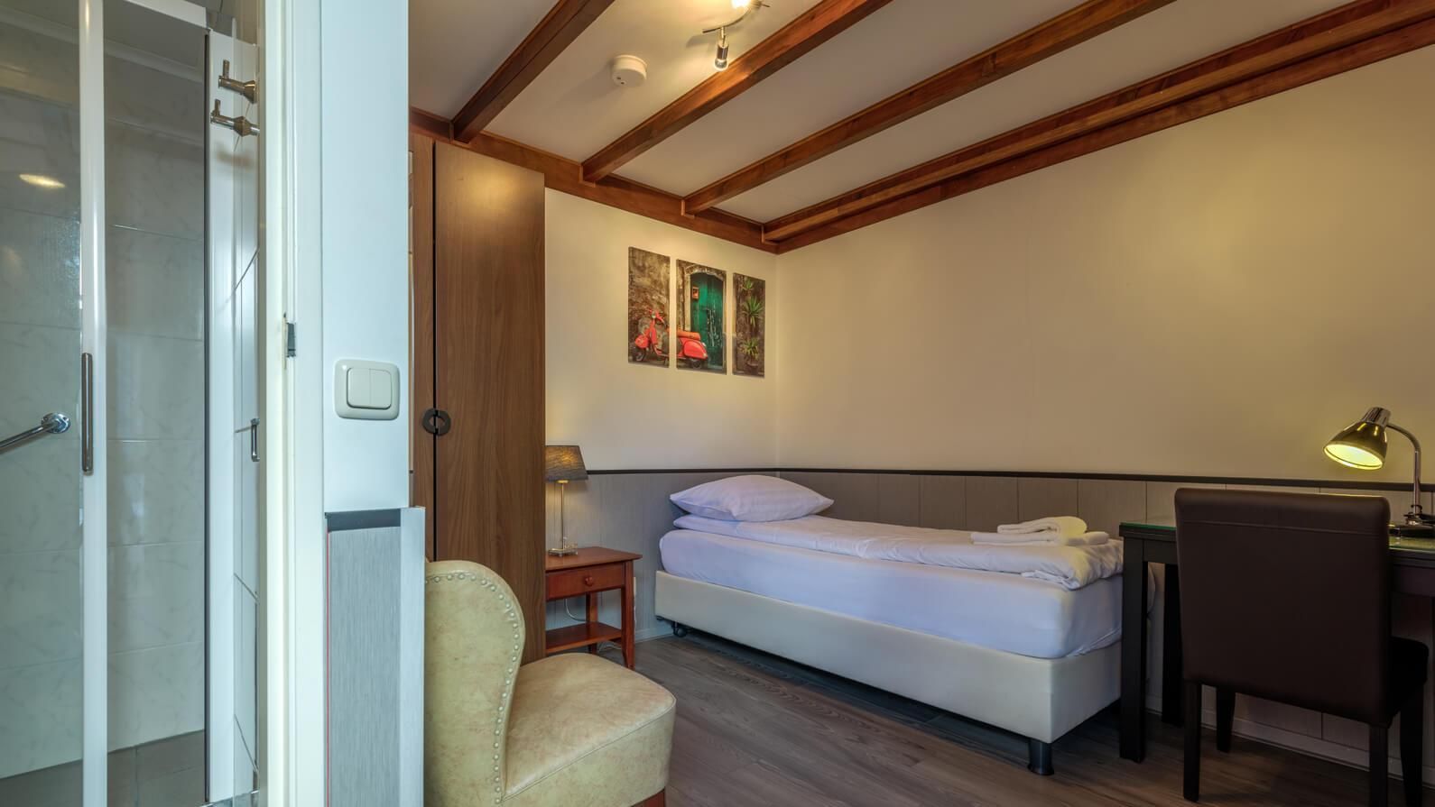 De budget eenpersoonskamer heeft een aparte douche en toilet ruimte die gedeeld wordt met 1 andere eenpersoonskamer.